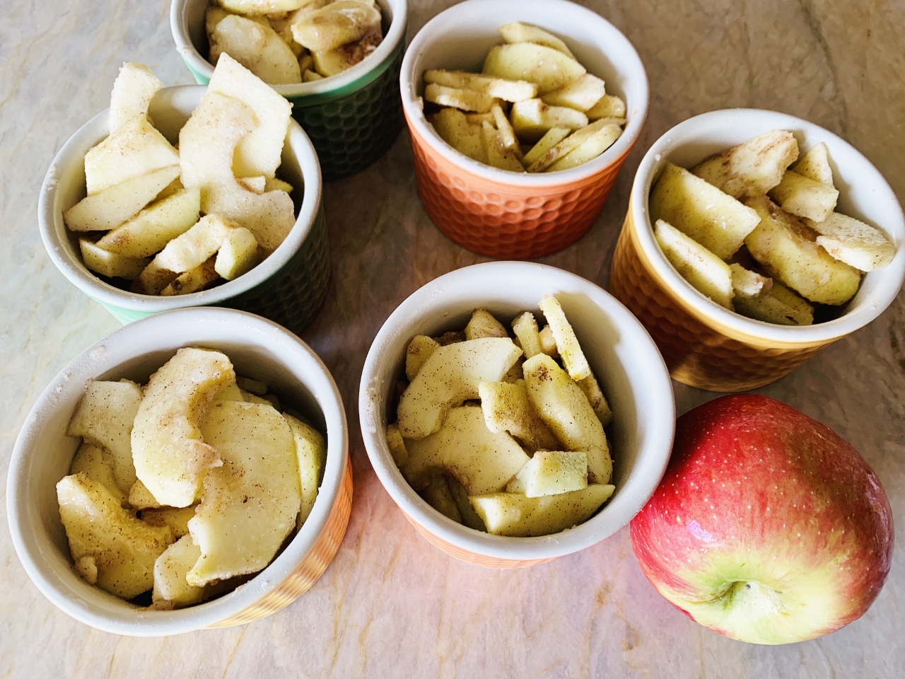 2. Peel and slice apples and place in a large bowl.  Add sugar, lemon juice and cinnamon, toss to coat.  Spoon apples into ramekins.