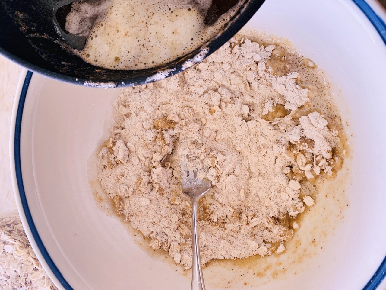 3. In a large bowl, add flour, oats, sugar, brown sugar, cinnamon and salt, stir.