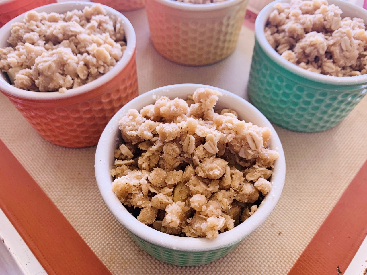 5. Pour butter into crust ingredients, while scraping mixture with a fork to create coarse crumbs.  Pile crumbs on top of apples.  Set ramekins on sheet pan.