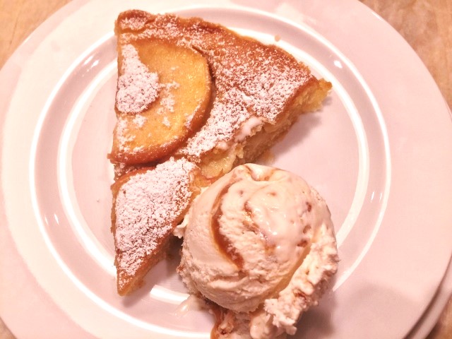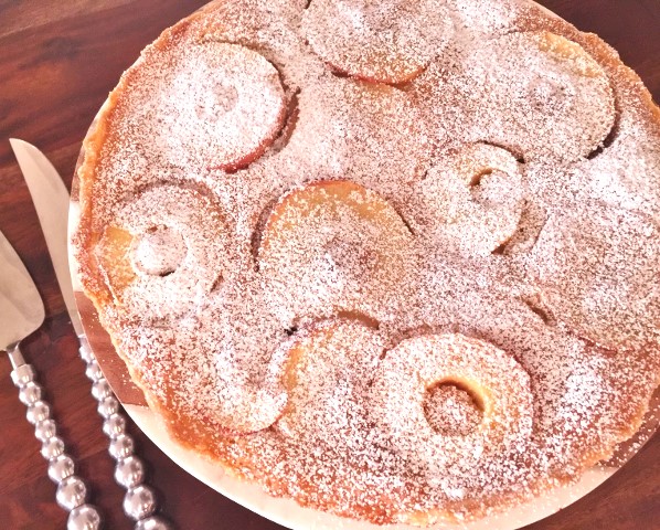 7. Pour over apples and bake on a sheet pan for 30-40 minutes or until golden brown and slightly puffed. Cool for 40 minutes and dust with powdered sugar. Slice and serve. Enjoy!