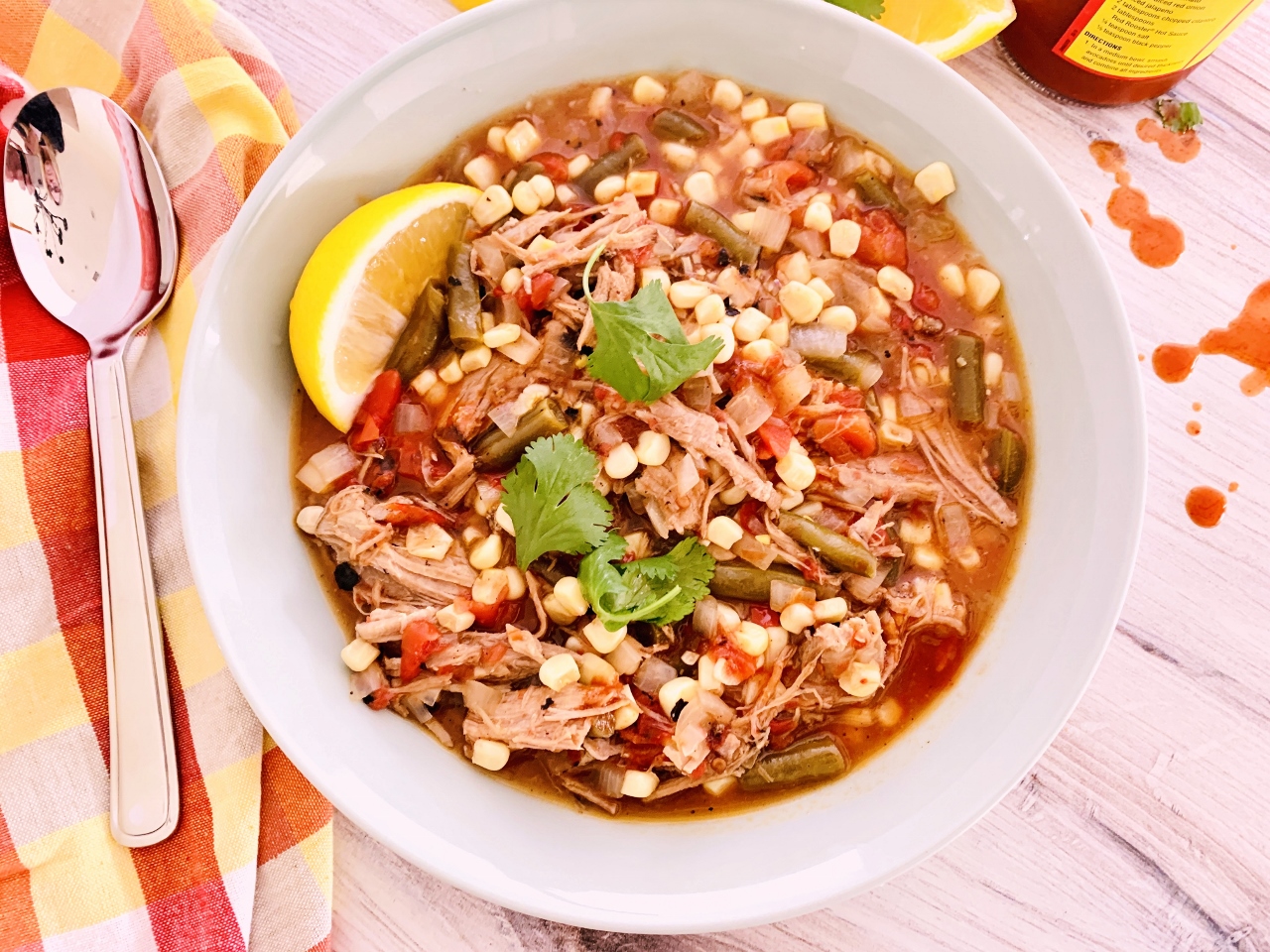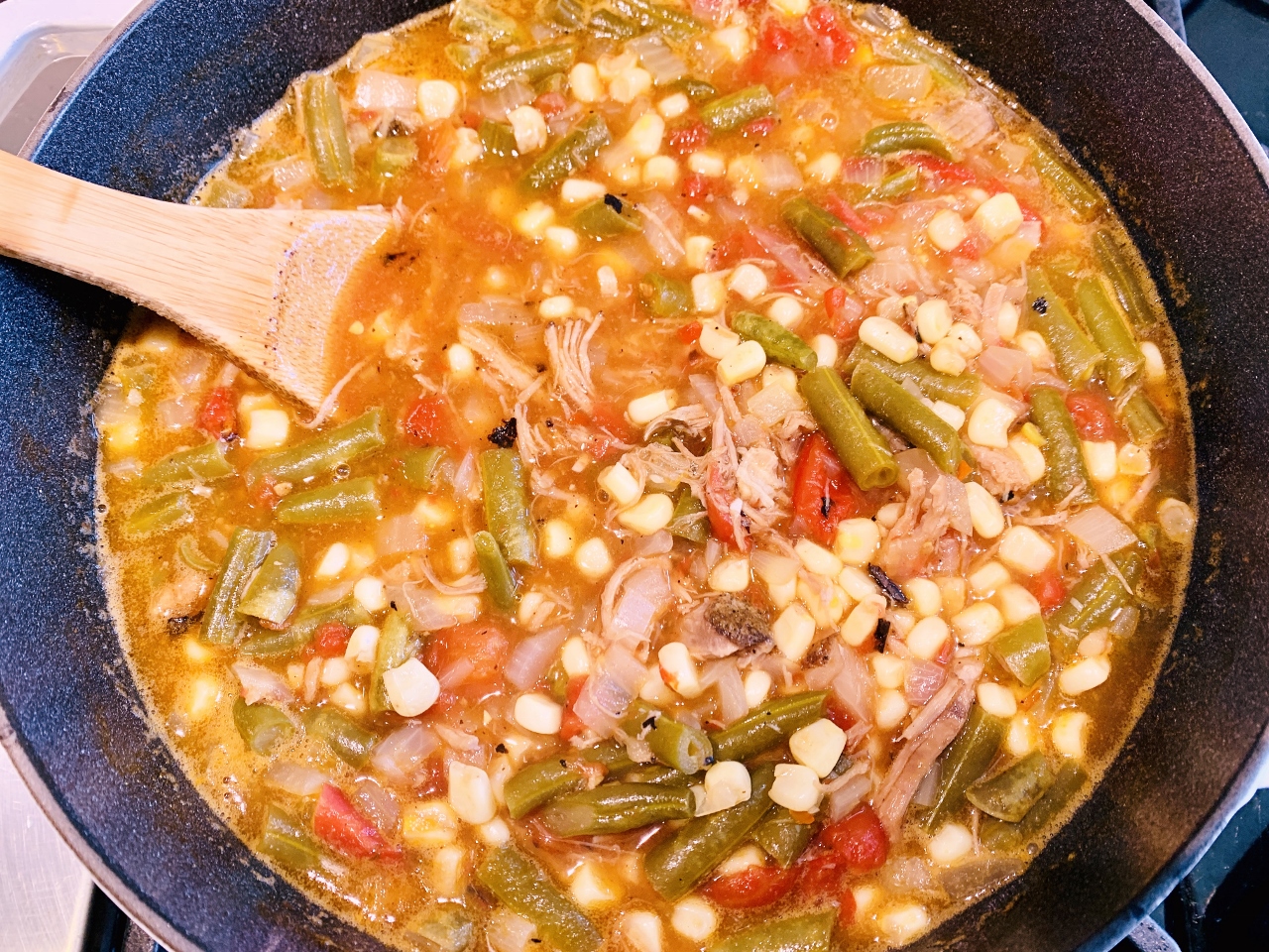 What makes Brunswick Stew so incredibly flavorful is that it tastes like it has a barbecue broth. Traditional recipes do not add barbecue sauce to the mix because that well-known taste is created by using roasted meat and other pantry items like sweet chili sauce, mustard and Worcestershire sauce. The other reason this dish is so compelling is that it’s sort of a dump recipe, if you know what I mean. You can add almost any variety of frozen or fresh vegetables, beans and tomatoes to the pot, making it the perfect clean-out-the-pantry meal.