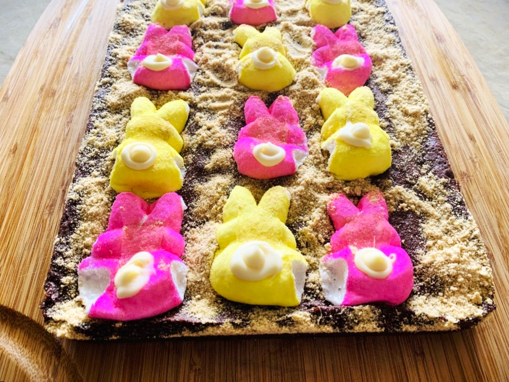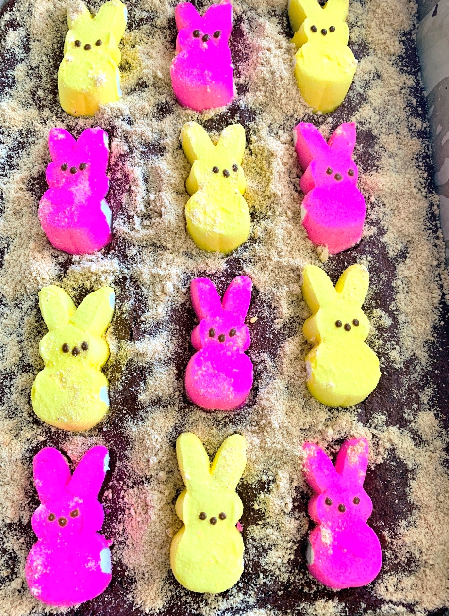 - Spoon batter into prepared pan and bake for 25-28 minutes. Remove from oven and place Peeps on top – space them into 12 portions. Sprinkle remaining graham cracker crumbs around Peeps. Bake in oven for 3-5 minutes or until Peeps are slightly puffed. Remove and let cool in pan for 1 hour.