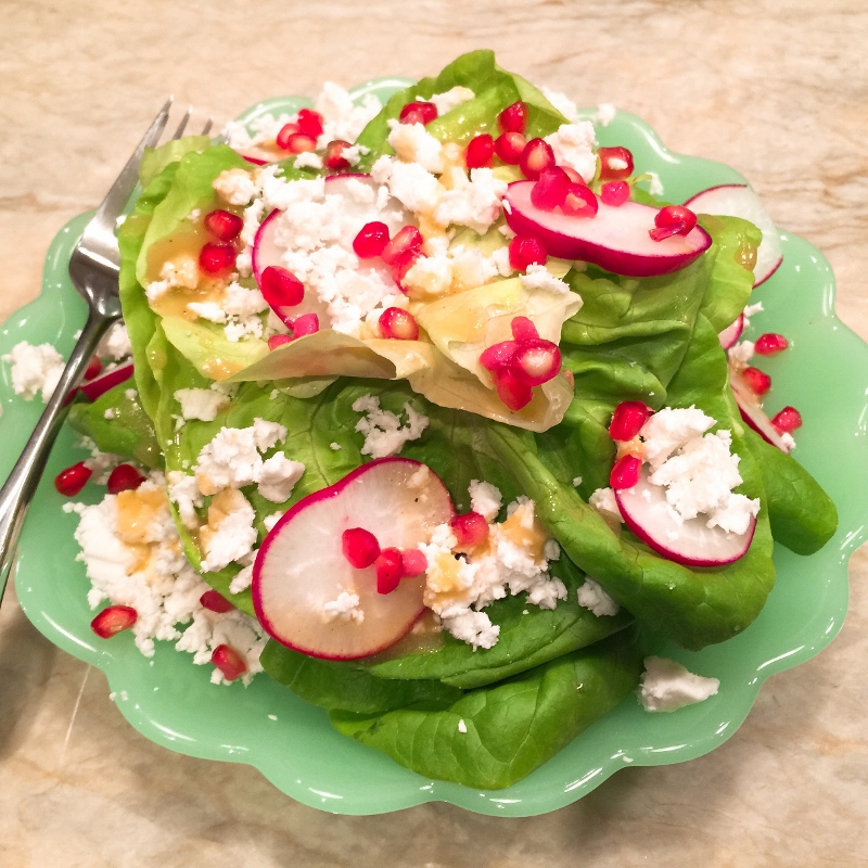 2. On salad plates, layer the leaves in a flower pattern. Sprinkle the tops and sides with radishes, Feta cheese and pomegranate seeds.