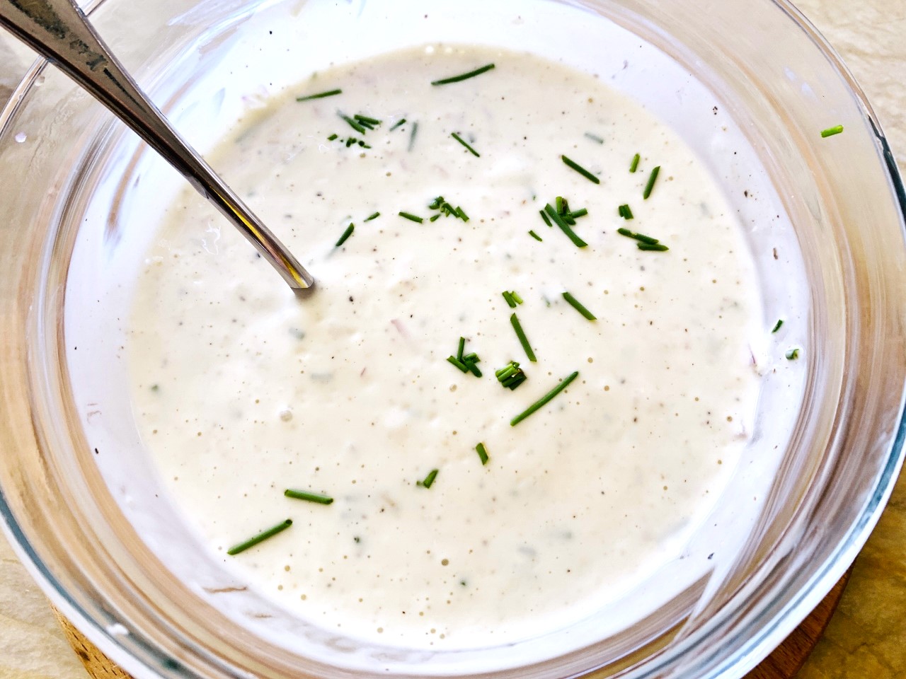 - Fold in chives with a spoon and serve, or keep chilled in refrigerator until ready to use. Enjoy!