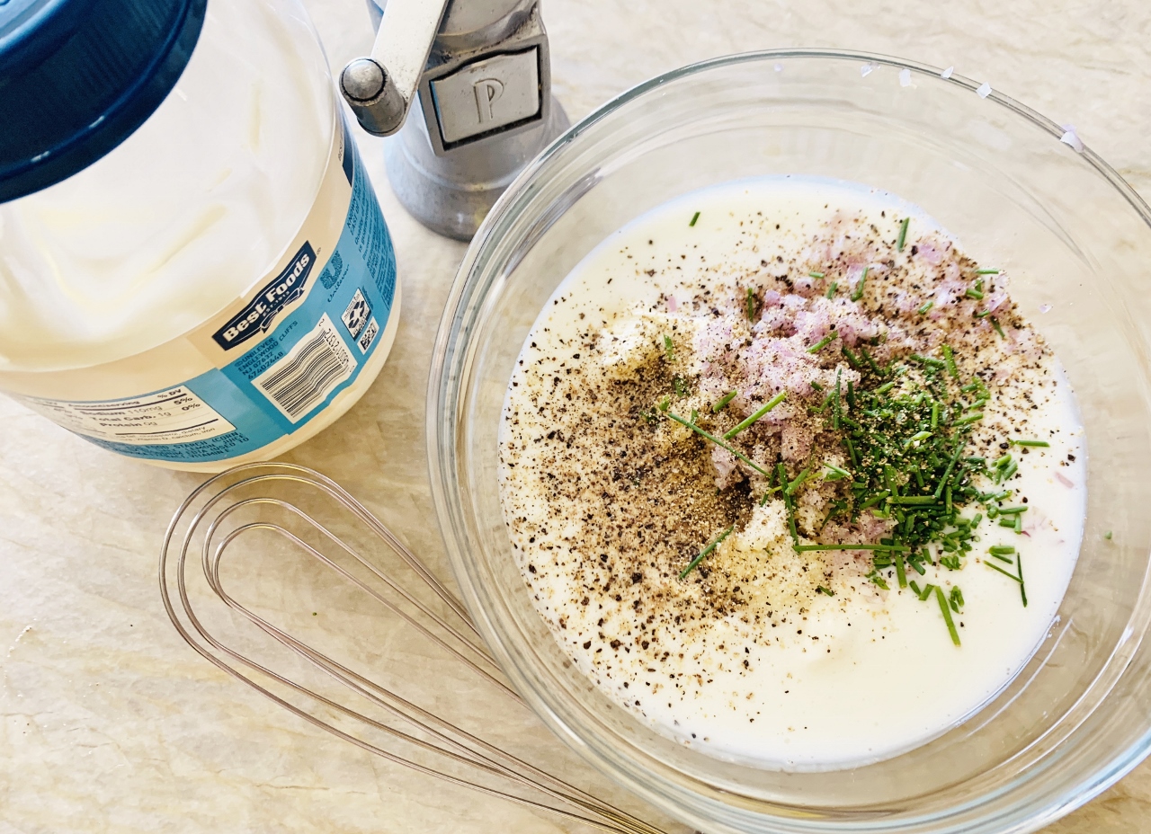 Good ranch dressing is a simple mixture of buttermilk, mayonnaise, a few dried spices and fresh chives. You whisk it up quickly in a bowl into a refreshing blend of flavors that can be tossed with bib lettuce, spread over sandwiches, or used a dip with crunchy carrots and celery. It’s so different from that bottled stuff – it’s cool and tangy, and so much more fun.