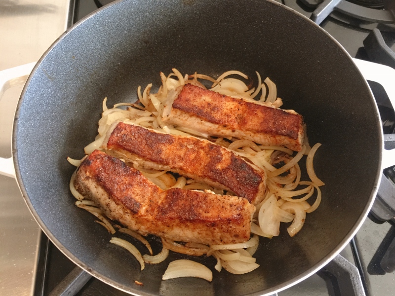 1. In a large Dutch oven, add 2 teaspoons of oil and place over medium heat. In a small bowl, combine the cumin, cayenne, onion powder, paprika, salt and pepper. Dust each ribs on all sides with herb mixture. When the oil is hot, add the ribs to the pot searing on all sides, about 8 minutes. Add the onions and garlic to the pot and stir. Cook for 2 minutes.