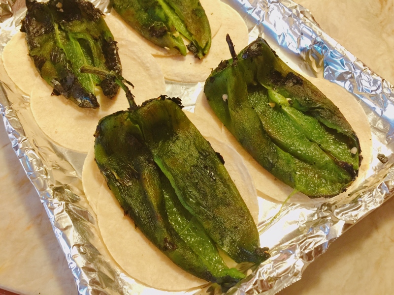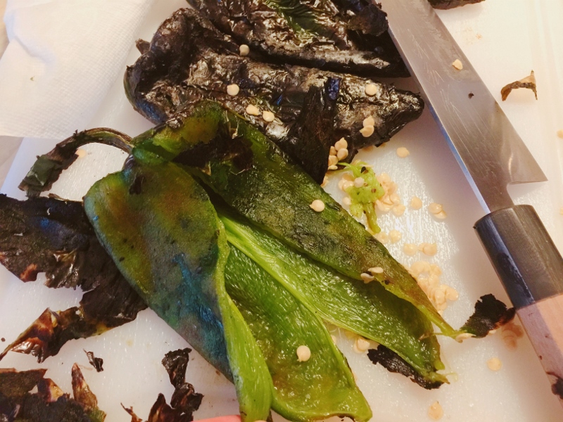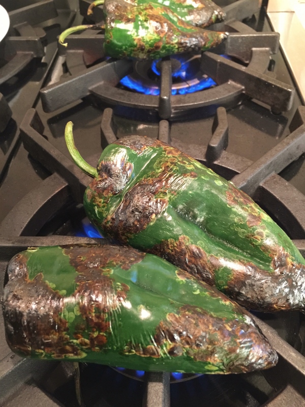 3. Place poblanos on gas grates and char on all sides. If you have an electric stove, char under broiler. Put charred peppers in a bowl and cover with plastic wrap for 10 minutes. Remove the peppers and using fingers slide the charred skin off on all sides of pepper. Slit the pepper 3/4 down on one side and remove the seeds.