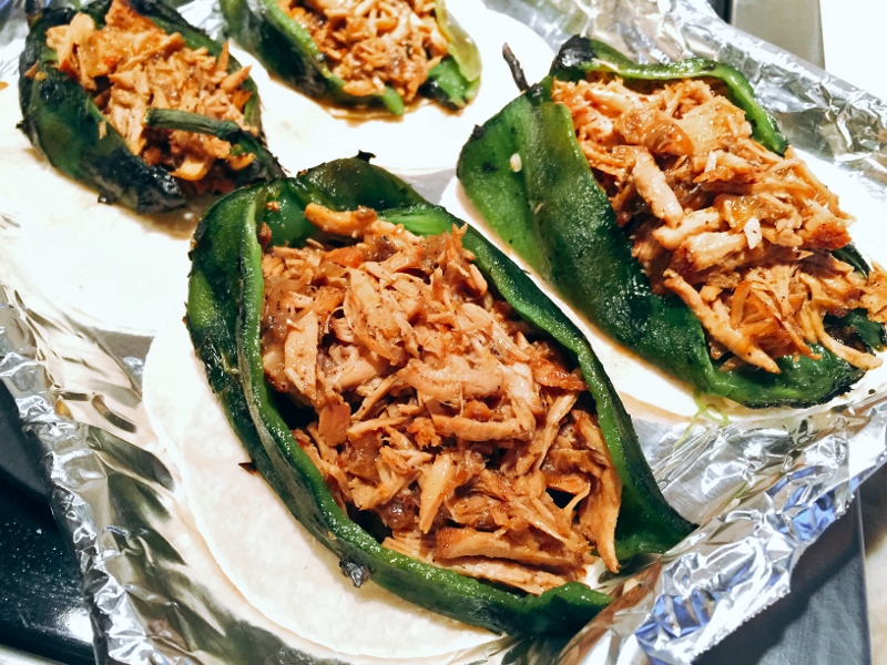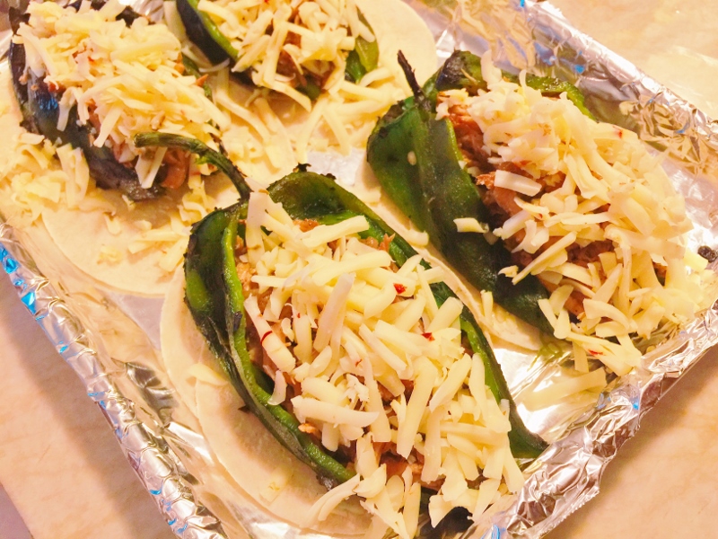 3. Cover sheet pan with foil and place pepper on top of 2 corn tortillas. Repeat until all the peppers are ready to stuff. Using a slotted spoon, fill each pepper with carnitas.