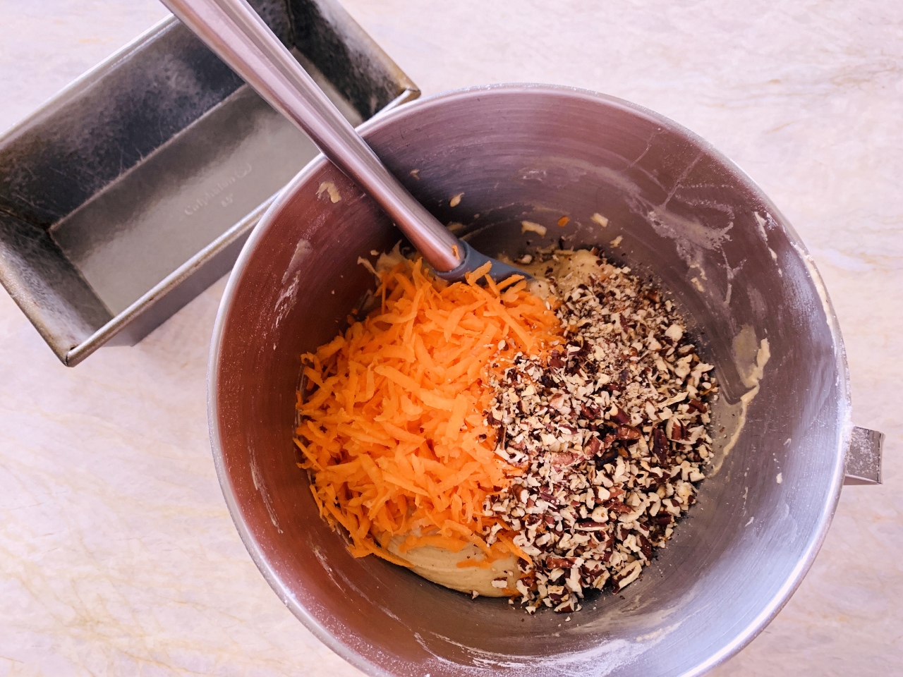 - Add vanilla and oil, continue to mix on medium speed for 2 minutes. Add dry ingredients on low speed, in batches until combined. Stir in carrots and pecans by hand. Pour into prepared pan and bake for 60-70 minutes, or until a toothpick comes clean.