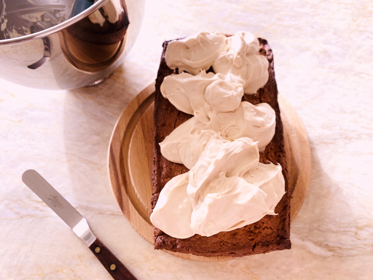Carrot Cake is filled with the most joyous ingredients like; shredded carrots, toasted pecans and in this recipe, a block of softened cream cheese, which is not only used in the frosting, but incorporated into the batter. Softened cream cheese gives this loaf cake a more tender crumb and chew. The outside of the cake bakes up into a auburn rectangle that pops when the maple cream cheese is swirled on top. The frosting is made with just a few ingredients and if you have any maple flavoring in the pantry, add a dash, but if not, maple syrup will give it enough maple pizzazz.