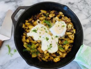 Food Breakfast Laugh Leftovers Dilly Hash and Eggs – Recipe! November 9, 2023 / November 23, 2025 by Gena Bell | Leave a Comment Whether it’s breakfast, brunch or dinnertime — a warm skillet of Dilly Hash and Eggs always seems to be so darn delicious. Using par-cooked or leftover baked potatoes is the key to a good hash. Turning basic spuds that are already rustic and creamy into a crispy herbal infused dish with soft eggs steamed over […] Read more » Breakfast cooking with Gena Bell Dill Recipes Dilly Hash and Eggs - Recipe! Egg recipes genabellrecipes Skillet Hash and Eggs