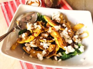 Food Salads Delicata Squash and Goat Cheese Salad with Balsamic Vinaigrette – Recipe! January 3, 2024 / November 23, 2025 by Gena Bell | Leave a Comment Delicata Squash is Butternut’s lighter cousin with a thin skin that doesn’t need to be removed before eating, which makes it even easier to prepare for this delightful Delicata Squash and Goat Cheese Salad with Balsamic Vinaigrette. Delicata Squash is simple to slice up and roast in the oven and toss on top of salads […] Read more » Balsamic Vinaigrette cooking with Gena Bell Delicata Squash & Goat Cheese Salad - Recipe! Delicata Squash and Goat Cheese Salad with Balsamic Vinaigrette - Recipe! Delicata Squash Recipes Salad Recipes Winter Salad Recipes Winter Squash Recipe