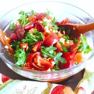 Food Salads Heirloom Tomato, Watermelon, Grilled Corn Salad – Recipe! July 1, 2024 / November 23, 2025 by Gena Bell | Leave a Comment Heirloom Tomato, Watermelon, Grilled Corn Salad is summer’s best. Crunchy sweet corn with mouthwatering freshly ripened tomatoes and watermelon all mixed in one bowl with a couple handfuls of arugula in a mustard vinaigrette make one delicious salad. I wait all year to taste the sweet flavors of summertime watermelon and tomatoes. These two fruits […] Read more » cooking with Gena Bell genabellrecipes Grilled Corn Salad Heirloom Tomato Summer Salad Recipes Tomato Salads Watermelon & Grilled Corn Salad - Recipe! Watermelon Salad