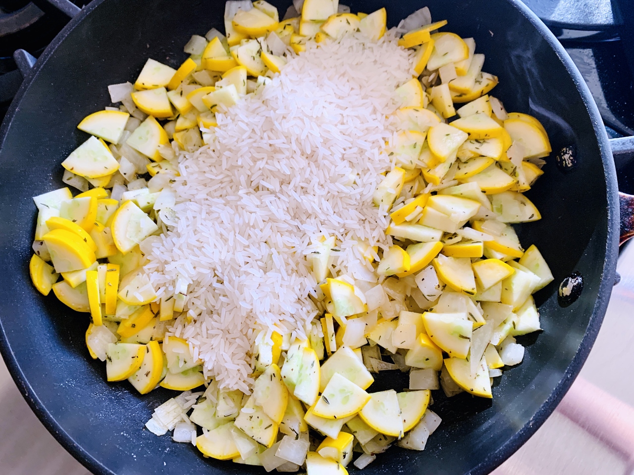 - Add squash and stir. Cook for 3 minutes, add rice and stir. Cook for 1 minute, stirring occasionally.