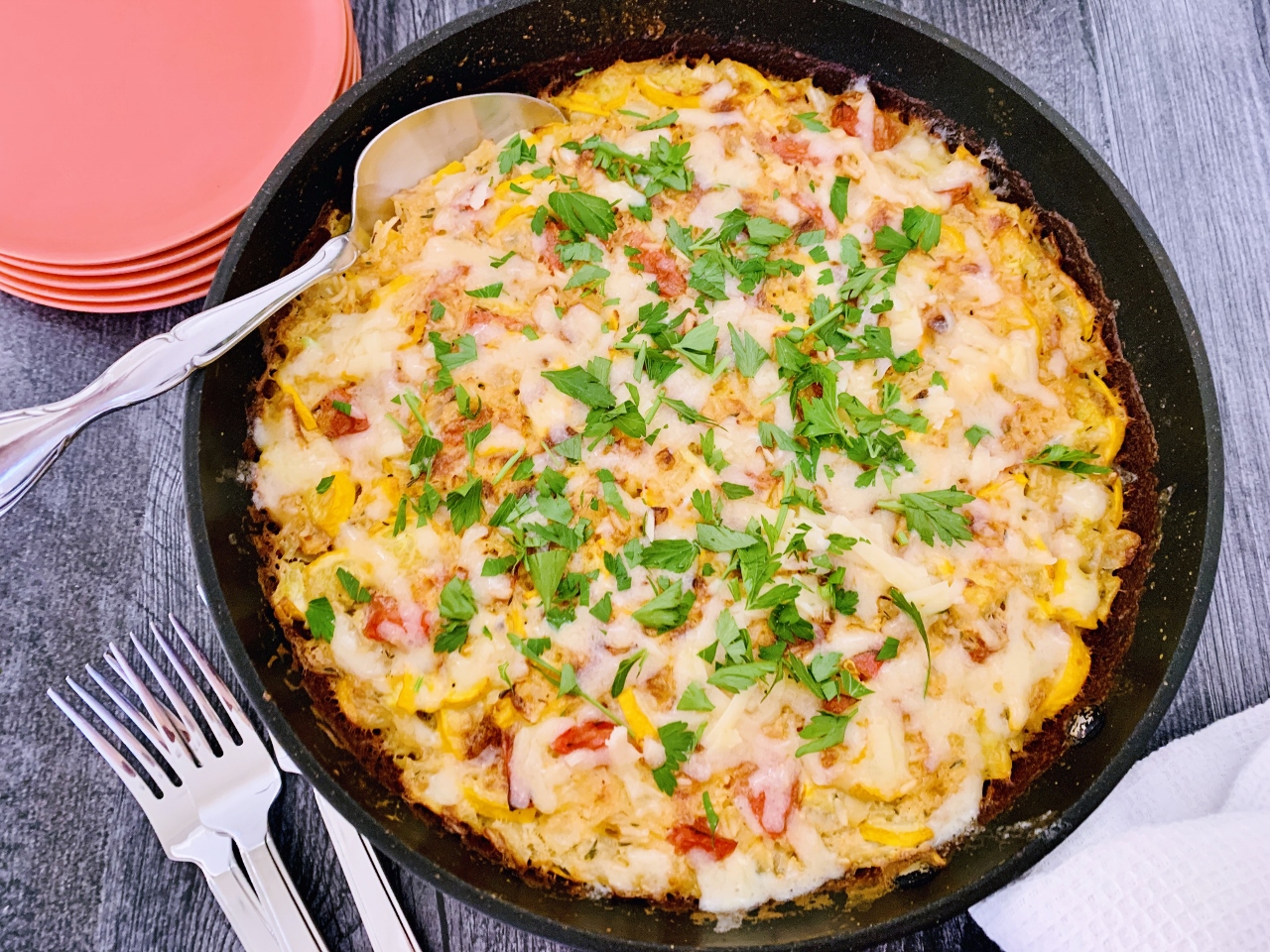 Eating vegetarian can be a good idea a few days a week because the meal can be loaded with good-for-you foods, while containing a few ingredients that say “comfort food” like cheese or dairy of some sort. Vegetarian skillet meals excite me because after being baked in the oven, the top always get super crunchy, while the ingredients beneath stay warm and cheesy. A simple combination of tomatoes, summer squash (yes summer), cheddar cheese and rice turns this skillet into one fabulous dinner.