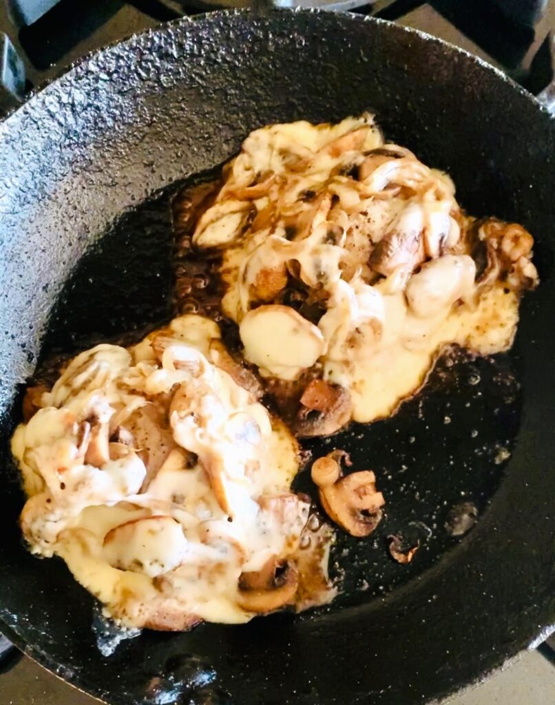 3. Add turkey patties to skillet and cook for 4 minutes.  Flip and spoon sauteed mushrooms and 1 slice of Swiss on top.  Repeat for each patty.