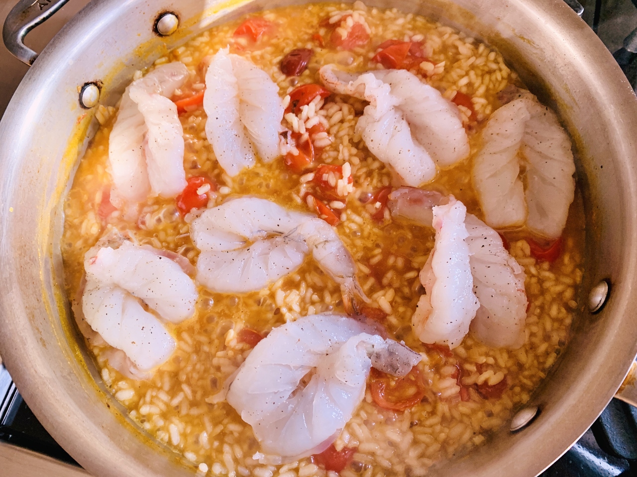 - Add 1/3 cup parmesan cheese, butter and remaining 1/2 cup broth, stir until creamy. Place butterflied shrimp over top of rice and place lid on top of pan. Turn heat to low and cook shrimp for 3 minutes. Remove lid and stir shrimp into rice mixture. Cook until risotto is al dente, and broth is mostly absorbed, but not dry.