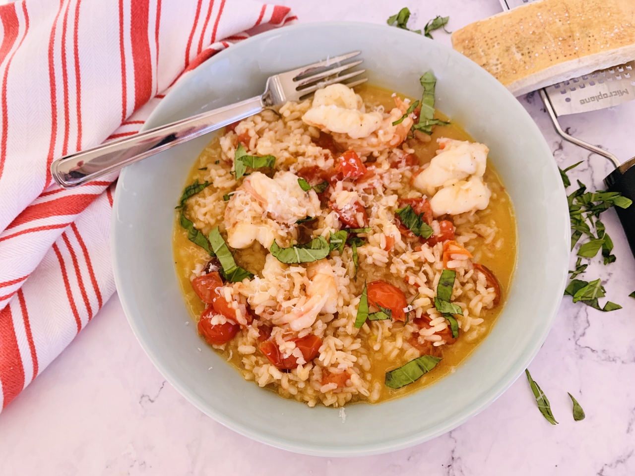 Large or jumbo butterflied shrimp are poached on top of the risotto at the very end of cooking, to release their juices into the broth, and create a perfect consistency for enjoying. The entire meal is done in less than 25 minutes, and the fresh basil on top permeates the aroma of the risotto with every spoonful. I do think it’s the perfect weeknight meal.