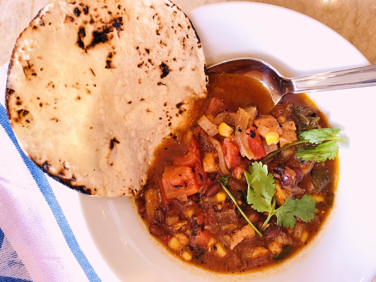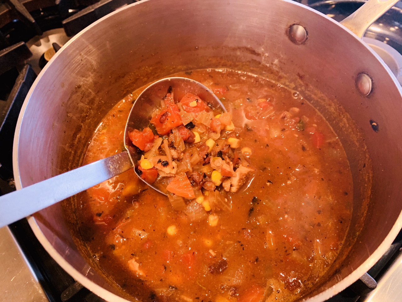 - Add tomatoes, corn and broth and turn heat to simmer. Cook for 20 minutes or until flavors come together. Toast tortillas on stove top, or under broiler and serve with soup. Enjoy!
