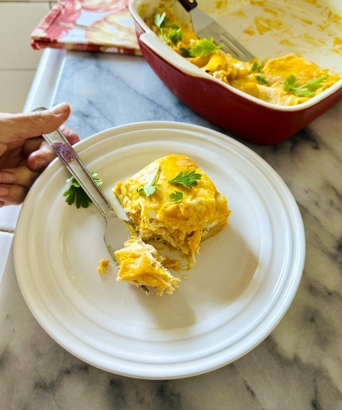 I used a rotisserie chicken that I shredded into bite sized pieces, but you can always roast or poach your own, if that works for you. Layering the lasagna in a casserole dish with sauce, noodles, mozzarella and chicken make it a classic style lasagna, but this one has a sauce that adds a bit of a delicious seasonal twist.