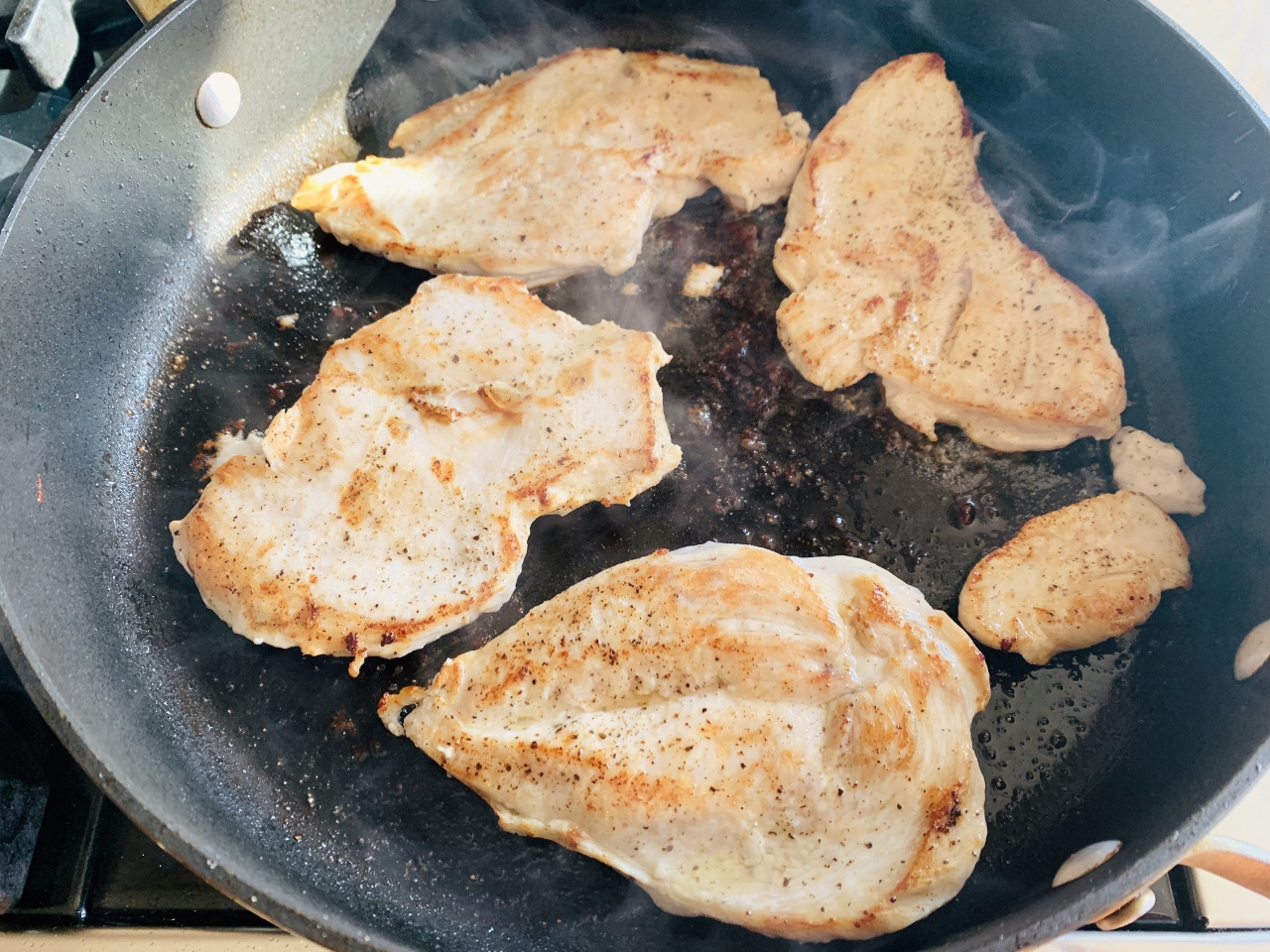 - Sear chicken for 3 minutes, flip over and cook other side for 3 minutes, remove chicken from pan and place on a plate.