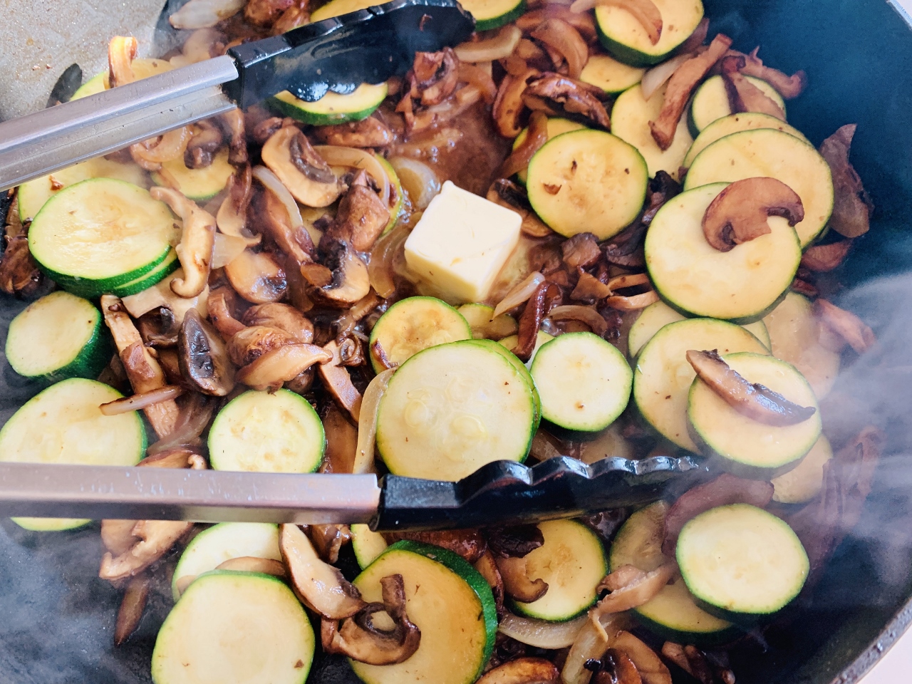- Add mushrooms and onions and cook for 4 minutes, stirring occasionally. Add zucchini and remaining butter, stir. Continue to cook vegetable for 3 minutes. Add 1/2 teaspoon salt and a pinch of black pepper, stir.