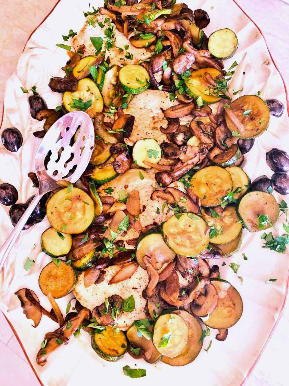 Chicken Paillard with Zucchini and Mushrooms is one of those dishes that looks impressive on a family-style platter, and tastes restaurant quality. I love the fact that you can have this gorgeous meal done in 15 minutes, or less, which will free you up for more time with family and friends. It’s also a good place to use up some of that summer zucchini.