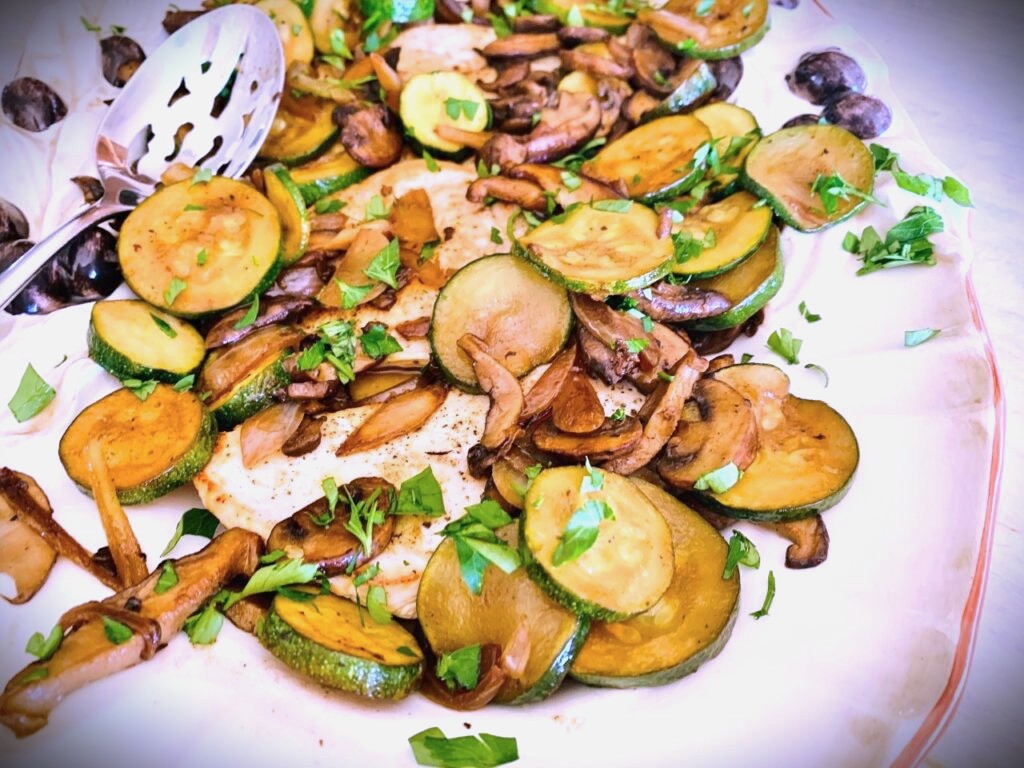 Boneless chicken breasts could often use a lift in taste because there isn’t any fat or bones to add to flavor. However, slicing chicken breasts in half horizontally and pounding thin, allows for a quick sear in the pan, and easy caramelization, which provides delicious flavor. Seasonal vegetables like zucchini and mushrooms cook up quickly alongside the chicken, offering a most magnificent meal in minutes.