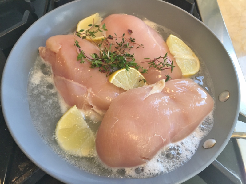 1. Preheat oven to 375. In a skillet, add chicken breasts, sliced lemon and fresh herbs. Add enough water to pan to come up half-way and place over medium heat. When simmering, turn heat to low, and cover with lid. Cook for 12 minutes or until chicken is cooked through. Remove from heat and cool. When ready to handle, shred chicken (you can skip this step and substitute a cooked rotisserie chicken, if desired).