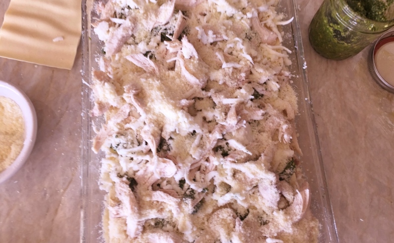 2. In a 4-quart casserole dish, layer 3 no-boil noodles. Dollop with pesto and ricotta and sprinkle chicken and mozzarella. Repeat this step and top entire lasagna with Parmesan. Pour half & half over lasagna.