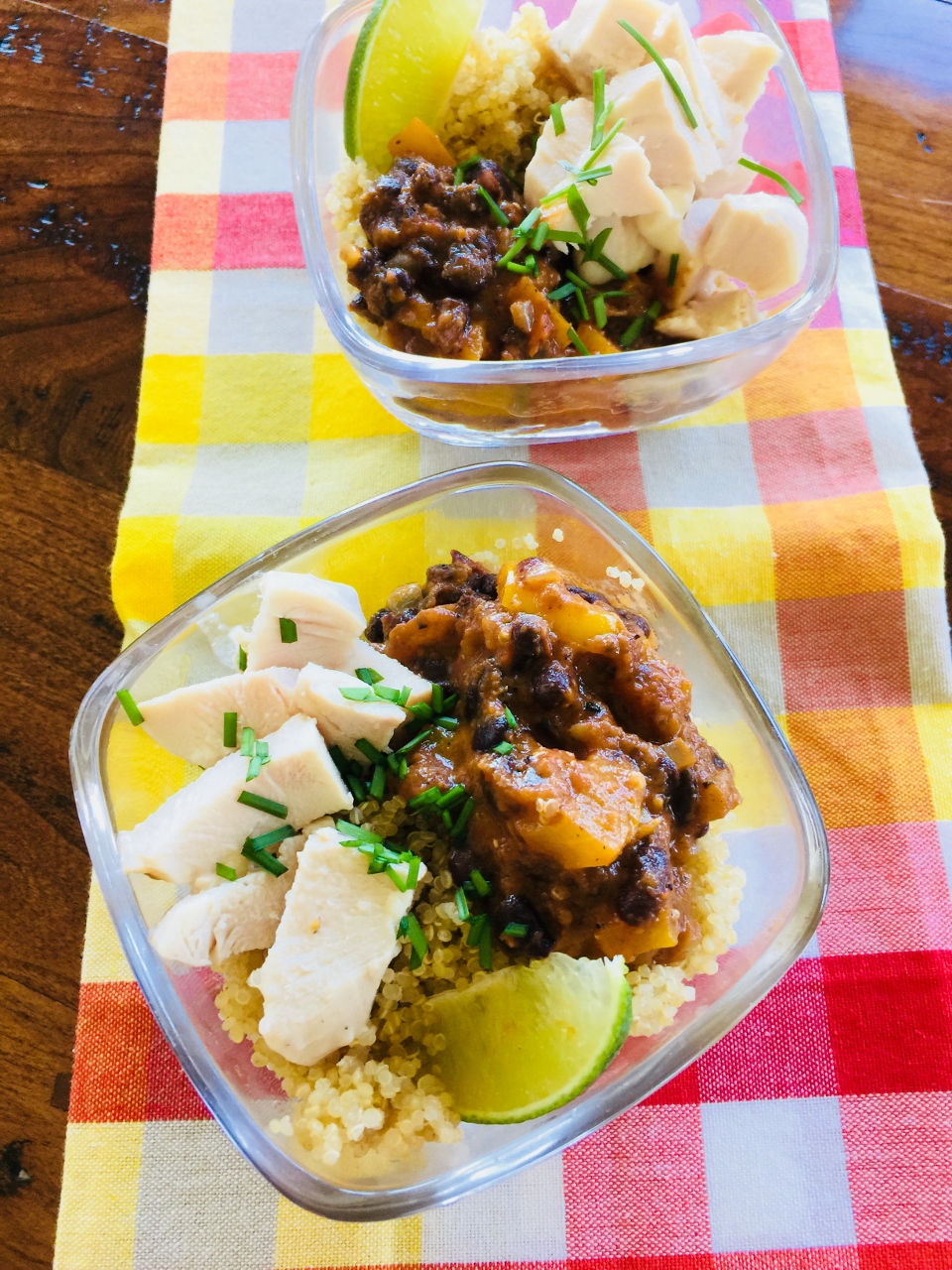 4. To assemble bowls – add 1/2 cup quinoa to each bowl, 1 cup of bean mixture and top with chunks of chicken. Top with your favorite things. Enjoy!