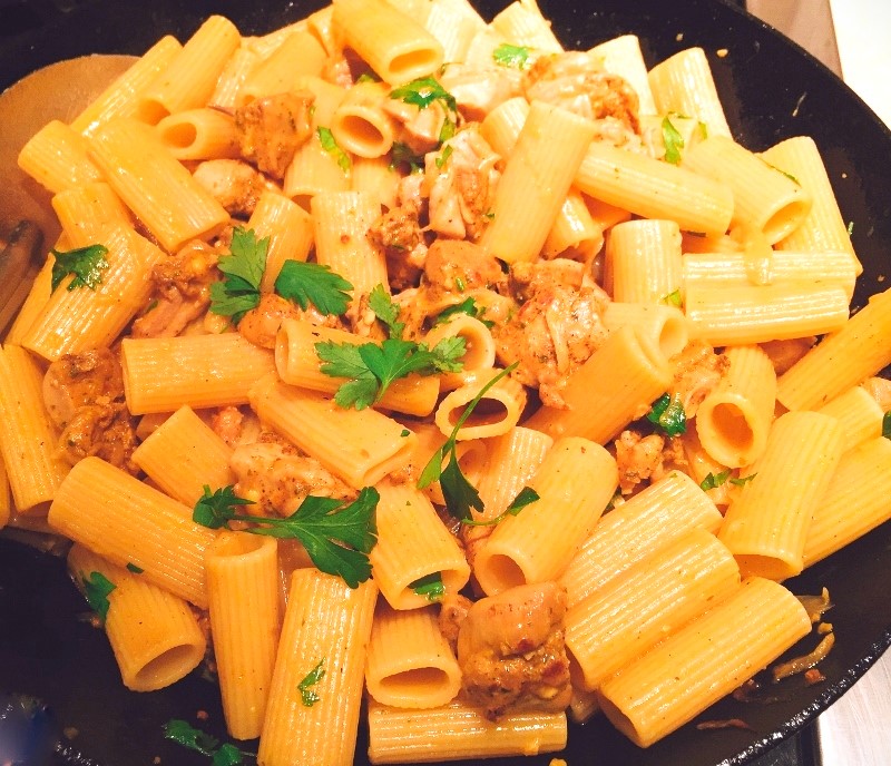 4. Using a slotted spoon or spider, place cooked rigatoni into chicken mixture. Toss to coat rigatoni and sprinkle with parsley. Serve family-style. Enjoy!