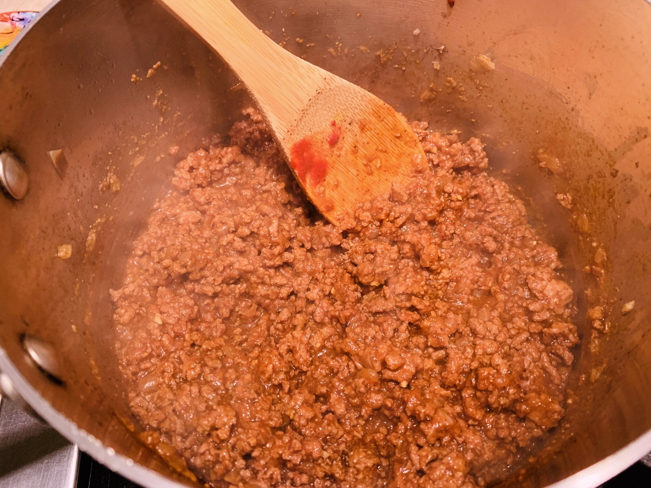 - In a saucepan over medium heat, add 2 teaspoons oil. Add 2/3 cup diced onion and saute for 2 minutes. Add 1 pound ground beef and break apart with spoon while cooking. Cook for 4 minutes, until cooked through.
