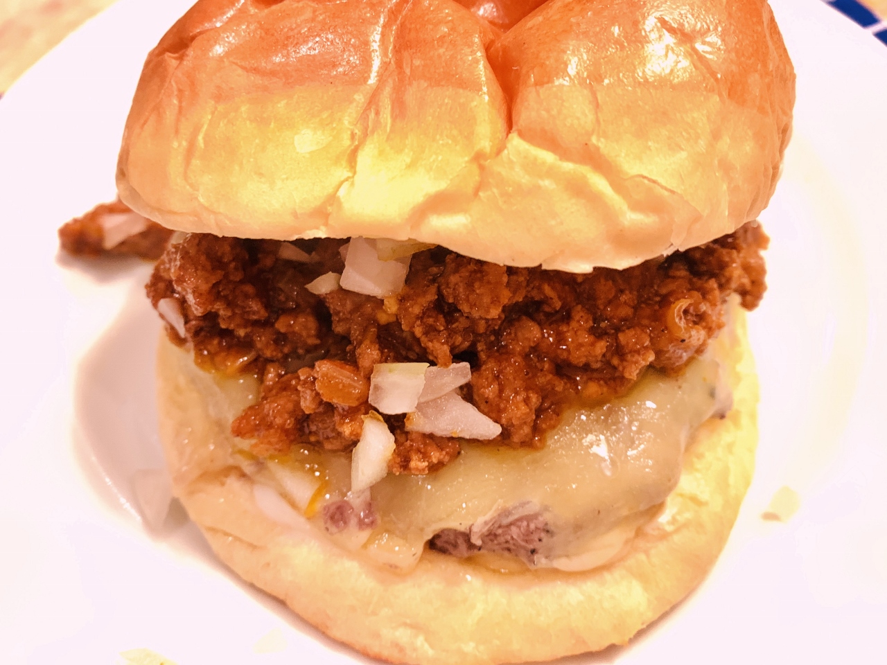 - Warm buns in oven, if desired and slice in half. Place patties on top of bottom bun and spoon chili over top. Sprinkle with remaining onions and top with remaining bun. Enjoy!