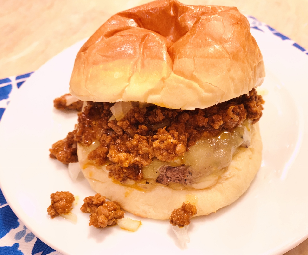 - Warm buns in oven, if desired and slice in half. Place patties on top of bottom bun and spoon chili over top. Sprinkle with remaining onions and top with remaining bun. Enjoy!