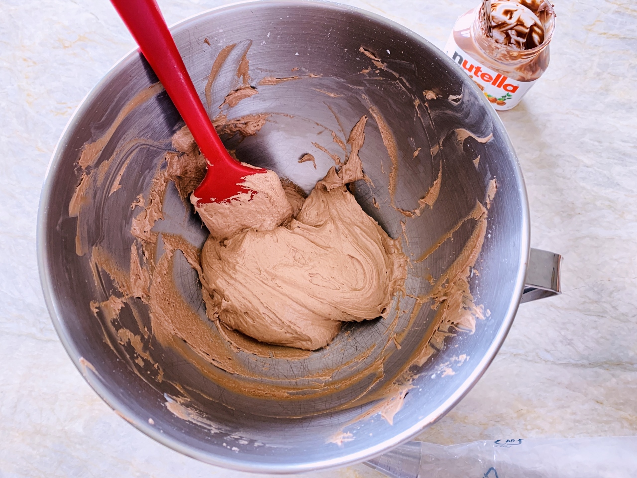 6. In a stand mixer, add Nutella and butter.  Mix on low speed for 1 minute.  Scrape down sides of bowl and add powdered sugar.  Mix for 1 minute, and while mixer is running, add heavy cream.  Turn speed up and mix for 1 minute on medium speed.