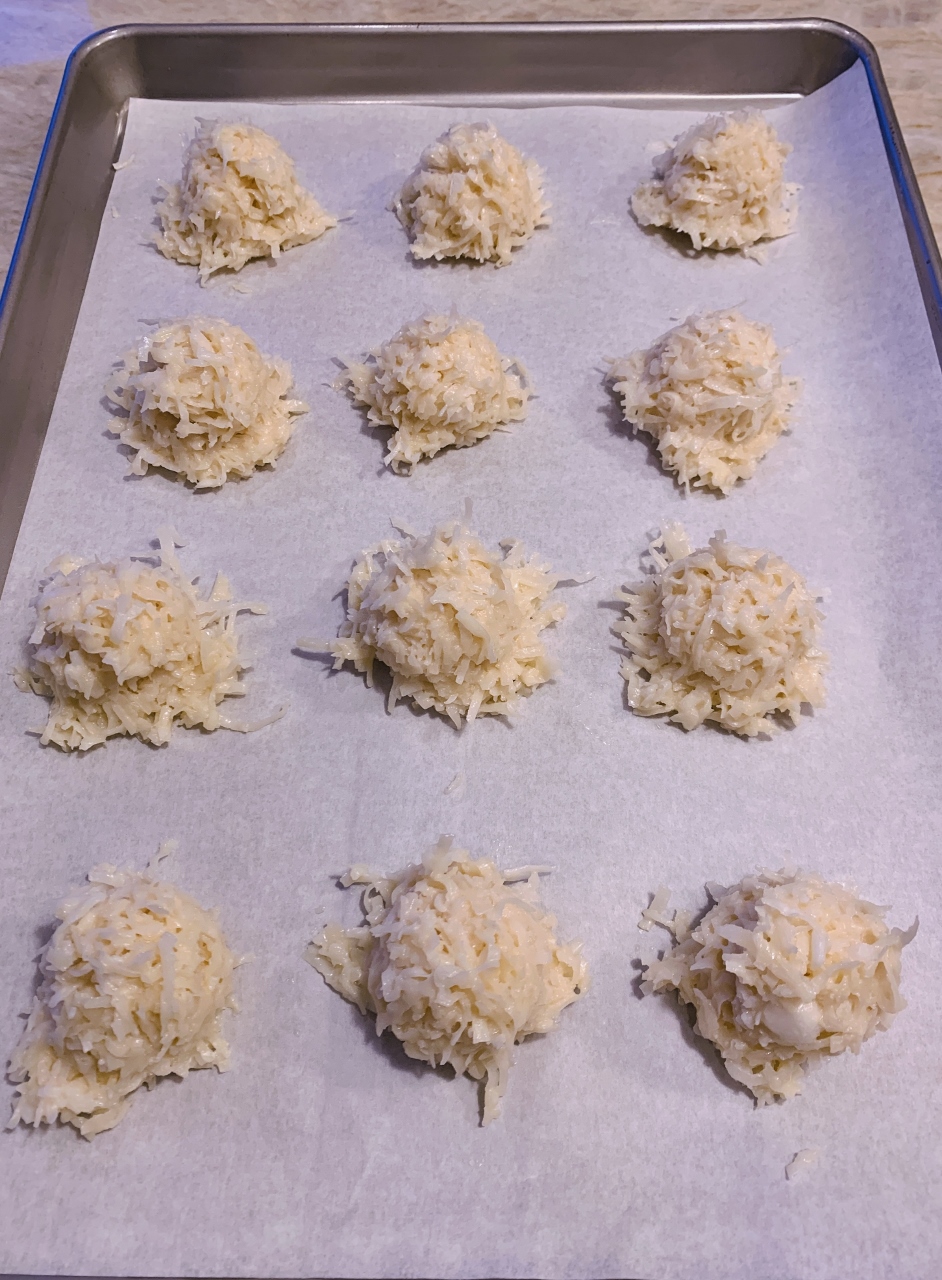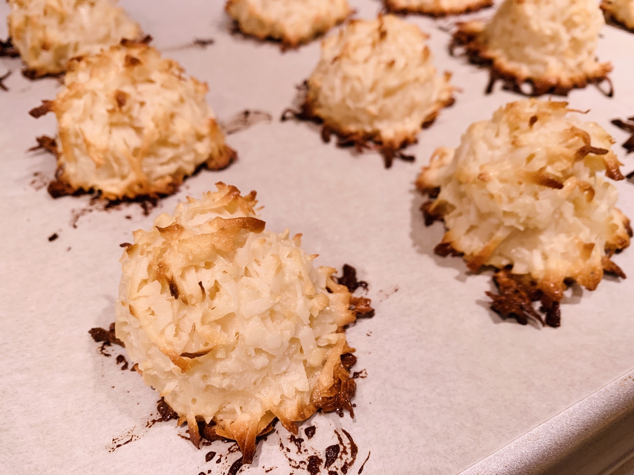- Scoop balls of coconut mixture onto a parchment lined baking sheet (press mixture into scoop for a mound effect). Bake for 18-20 minutes, or until deep golden brown around edges and on top. Remove and let cool completely.