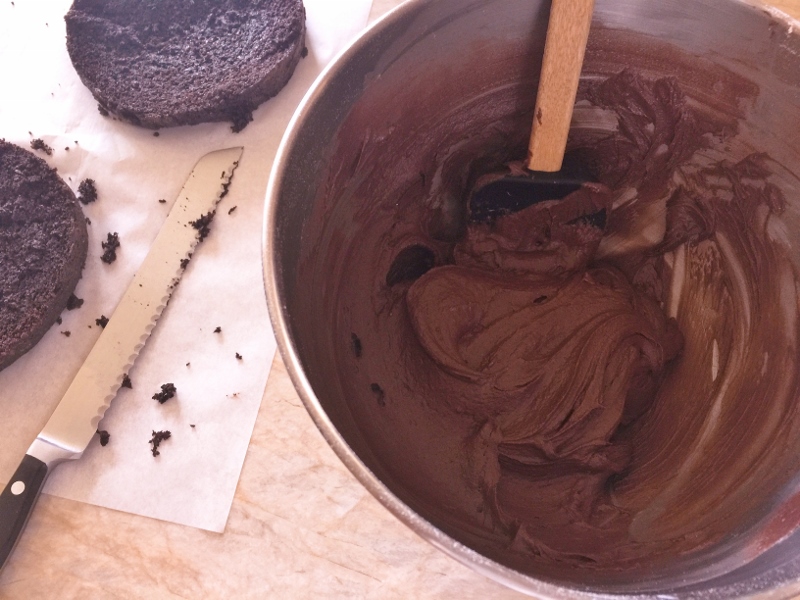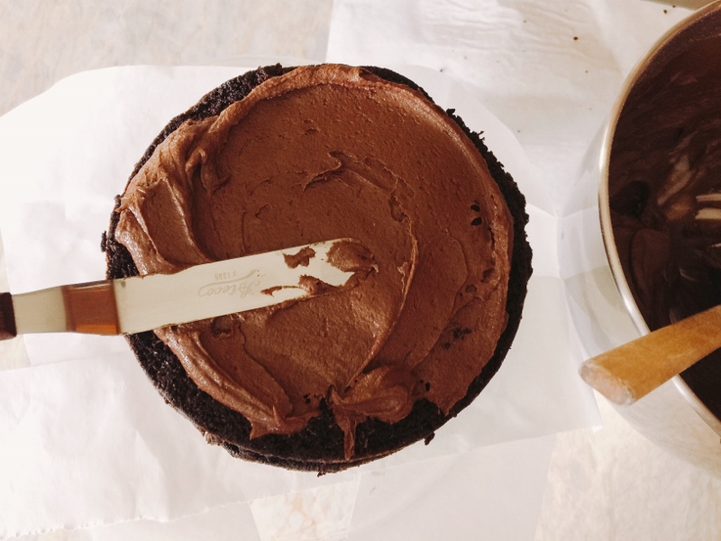 2. In a stand mixer or large bowl, whisk together butter and confectioners sugar for 2 minutes on low speed. Add cocoa powder, vanilla and salt, whisk for 1 minute. While the mixer is running on low, pour in the buttermilk. Whisk on low for 2 minutes. Place one layer on cake stand with strips of parchment underneath (this keeps the stand clean after frosting). Put a third of frosting on top of first layer, spread to the edges. Place second cake layer on top and frost the entire cake with remaining frosting.