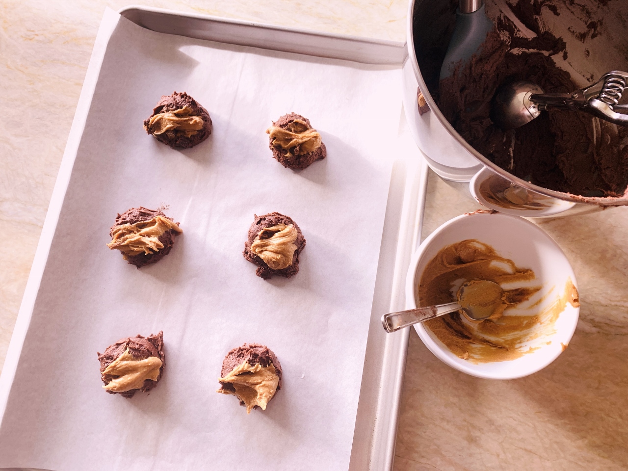 5. Scoop cookies out into balls and top with a teaspoon of peanut butter, pressing slightly and schmearing across top.
