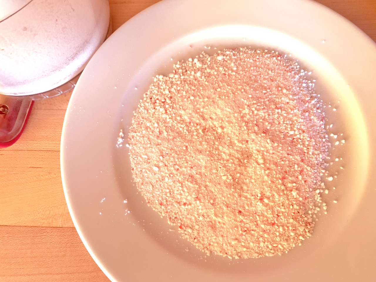 - In a food processor or blender, pulverize candy cane and pour onto a plate.