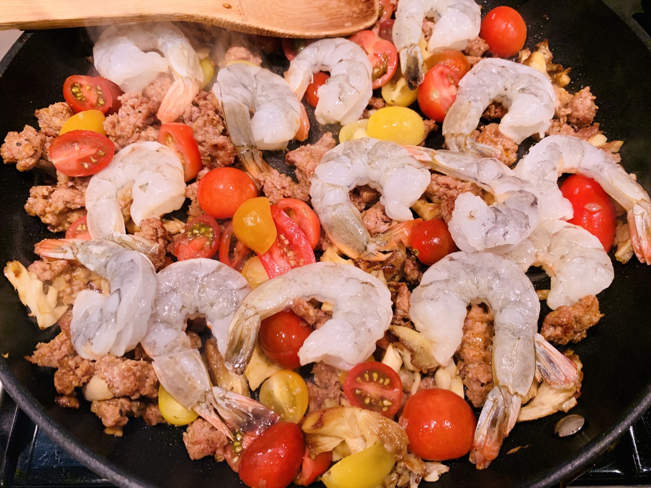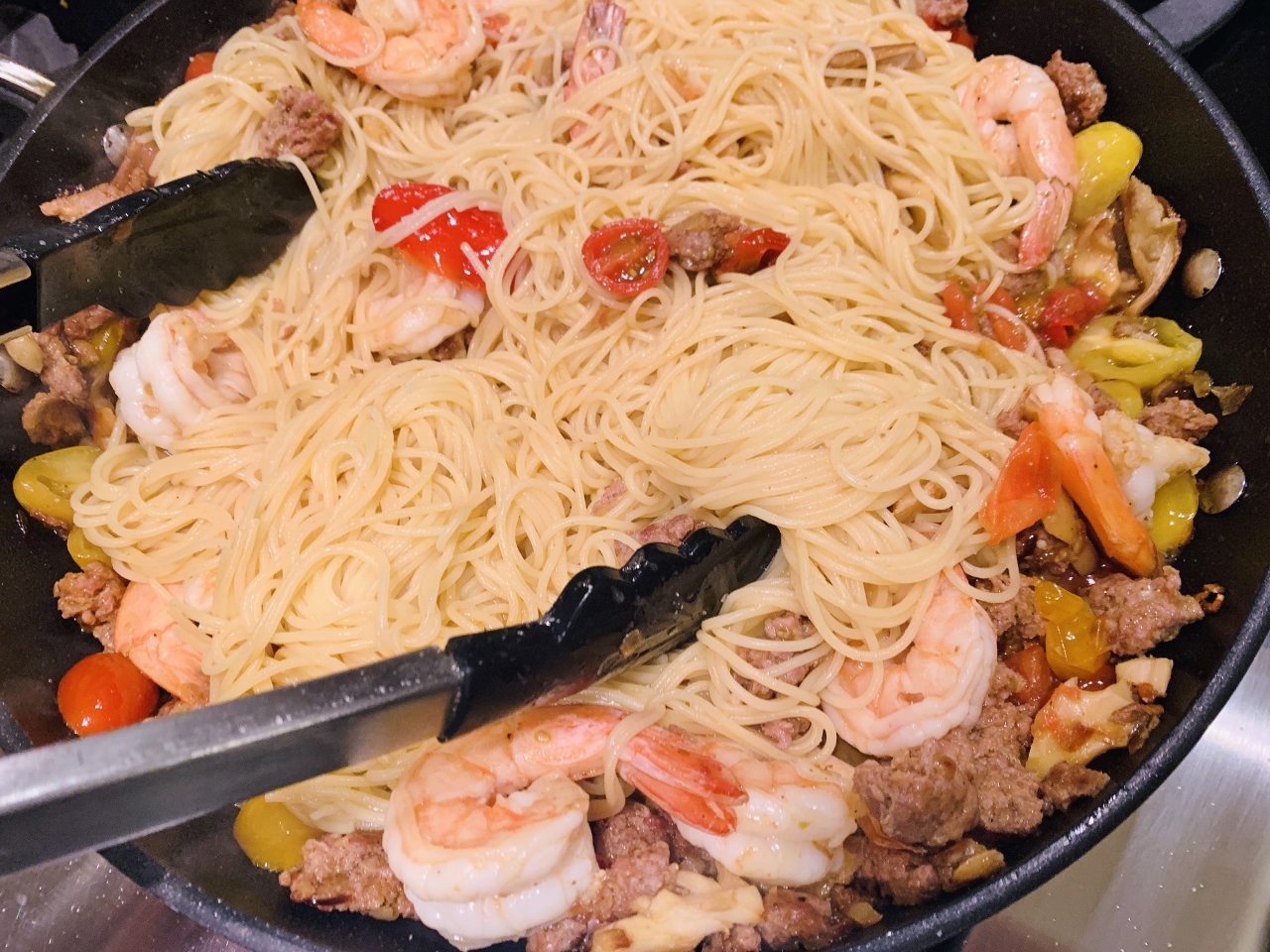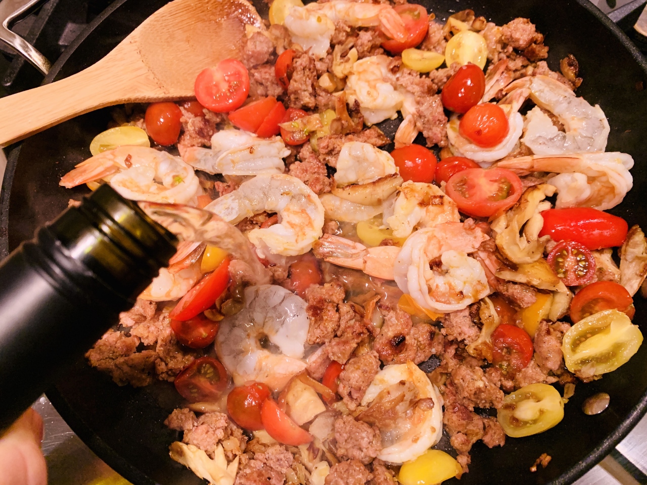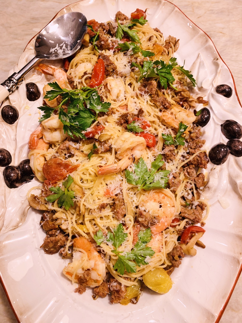 This pasta dish is mostly a one skillet meal, except for boiling angel hair in a separate pot. The pasta absorbs the richness from all the ingredients and a splash of wine brings a hint of acidity to the sauce. I like to serve it family-style on a platter, so my guests can serve themselves, and enjoy bites of shrimp, tomato, sausage, and pasta in every spoonful.