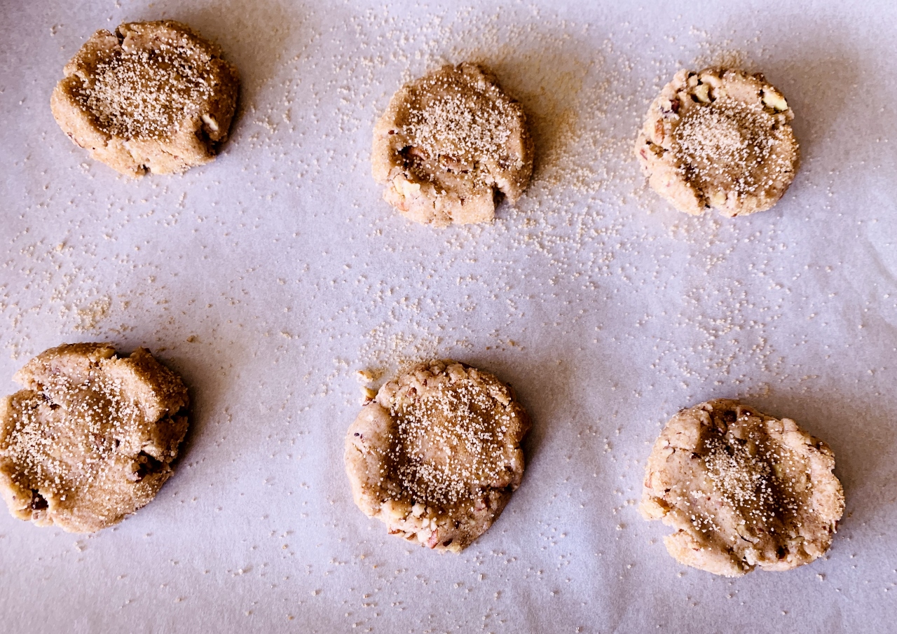 To make these chunky pecan cookies, I used a mixture of whole wheat and white flours because pecans need some structure to hold onto while baking. I also think the earthy notes of whole wheat flour compliment sweet nutty pecans, and make a good marriage in any dessert. The maple sugar that these cookies are rolled in make a great crunch after baking, but if you don’t have maple sugar, or can’t get your hands on a jar, turbinado, or any nut-flavored sugar will work nicely too.