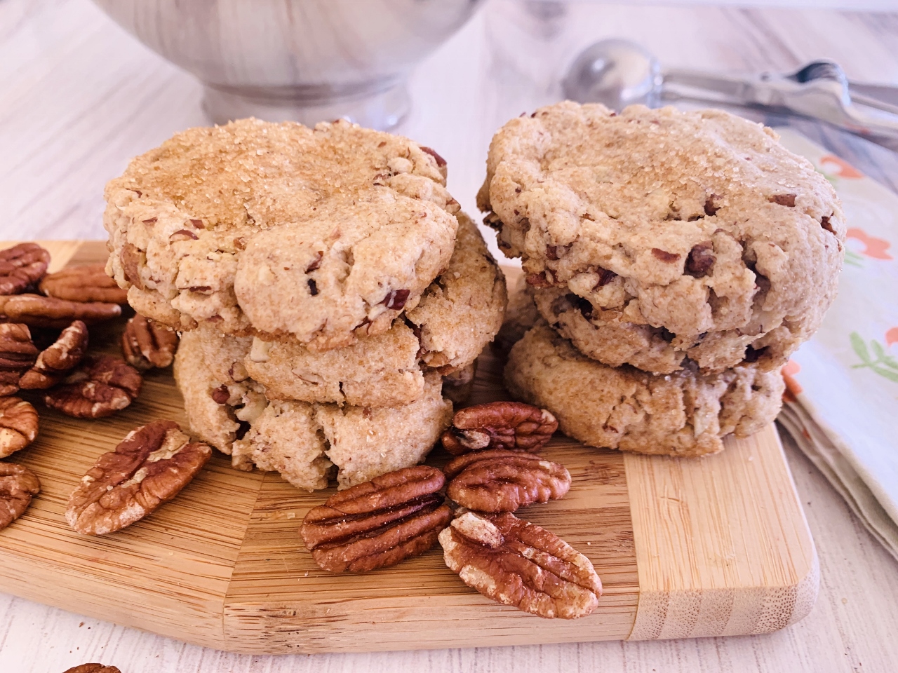 - In a stand mixer or large bowl, cream butter and 1 cup granulated sugar, about 3 minutes. Scrape down sides of bowl and add dry ingredients on low speed, about 1 minute. Add pecans and mix by hand until incorporated.