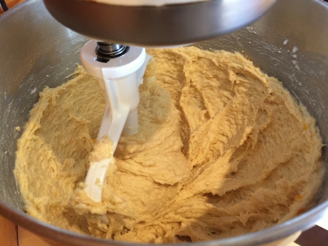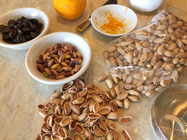 1. Shell pistachios and zest orange. Mix together yeast, water and 1/2 teaspoon sugar. When yeast is lightly bubbly it is ready. In a stand mixer, combine flour, sugar and salt on low speed for 1 minute. Add in yeast mixture, butter, 2 eggs, milk, orange flour water and zest, continue to mix on low speed for 3 minutes.