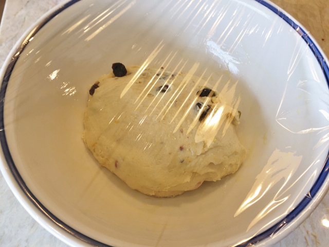 2. Add in pistachios and sour cherries and continue to mix for 1 minute. Remove dough from stand mixer and place in a greased bowl. Cover with plastic wrap and place in refrigerator overnight.