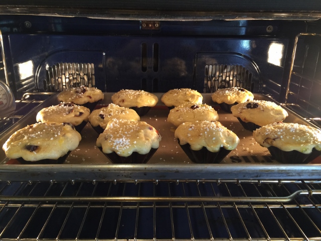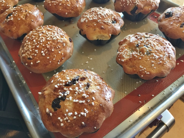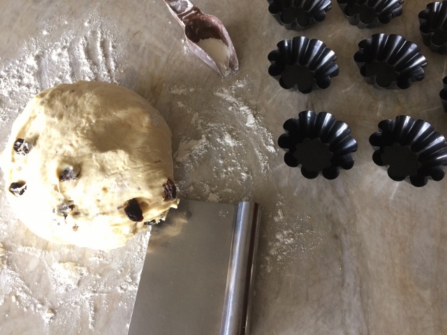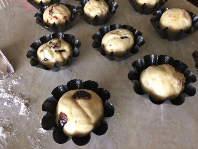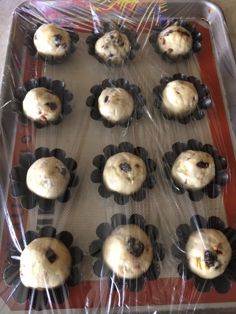 3. Remove dough from refrigerator, and place on lightly flour dusted surface. Grease 3-inch fluted tins or muffin pan. Cut dough into 2 ounce pieces and roll into balls. Place ball into tin and repeat, until all tins are filled. Cover loosely with plastic wrap and let proof about 1 hour, or until slightly risen above cup line.