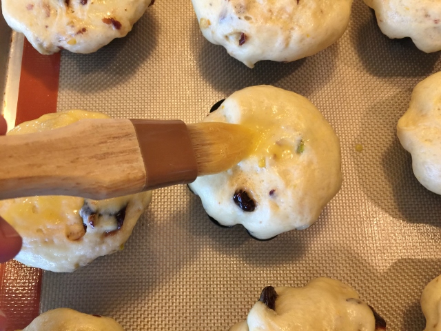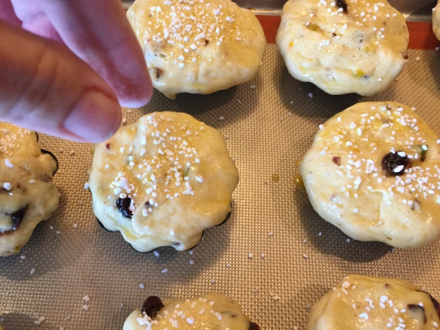4. Preheat oven to 350 degrees. Whisk remaining egg until frothy, and brush the tops of brioche. Sprinkle with pearl sugar and bake in the oven for 18-22 minutes, or until deep golden brown on top.