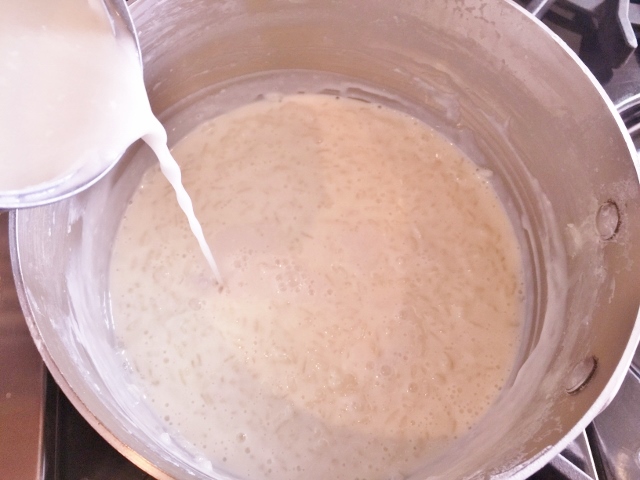 2.  Add coconut milk and continue cooking for 10 minutes, stirring occasionally.  Keep rice at a low boil, so it doesn’t burn.  Remove pudding from heat and let rest in pan for 5 minutes.