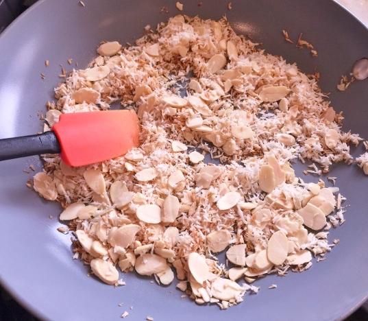 3.  In a saute pan, toast almonds and coconut over low heat until golden brown, about 2 minutes, set aside. Spoon pudding into serving bowls and cover with plastic wrap, chill for at least 2 hours.  Top pudding with toasted coconut and almonds right before serving. Enjoy!