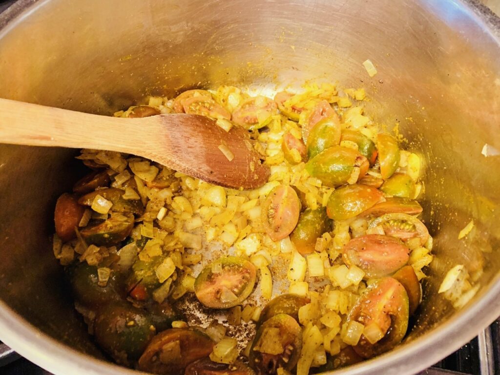 - In a large pot over medium heat, add 1 tablespoon oil and diced onion. Saute onion for 3 minutes and add curry powder, stir. Add 2 teaspoons salt and 1/2 teaspoon black pepper, continue to cook for 1 minute. Add sliced tomatoes and stir. Cook mixture for 4 minutes, until tomatoes softened.